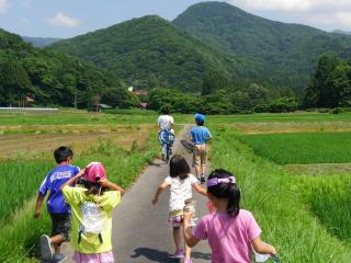 子どもたちは田植えよりカエル採りに夢中です。