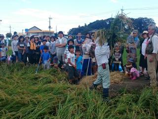 縄の材料の稲ワラは、みんなで田植え・稲刈りした田んぼの隅で育てた別品種のものです。