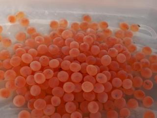もう、黒い眼が目立ち始め、稚魚の体全体が分かります。積算温度は350℃位だそうです。