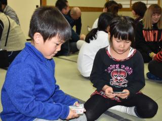 食事のあとは大広間で「お楽しみ会」始めに「風船ゲーム」